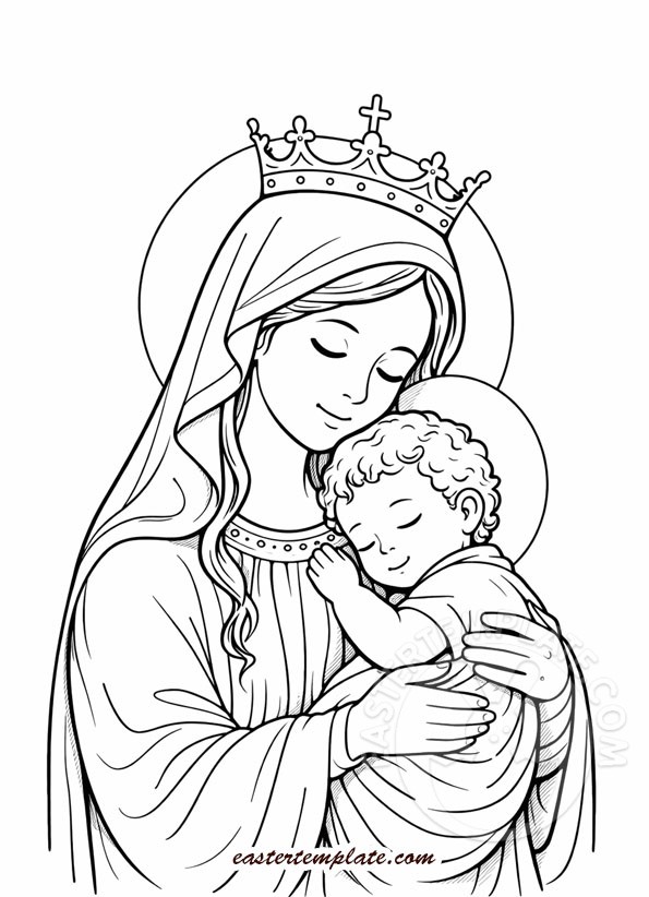A tender illustration of Mary holding the Baby Jesus, perfect for children to color during religious celebrations. Download and print this peaceful image to inspire faith and creativity at home or in the classroom