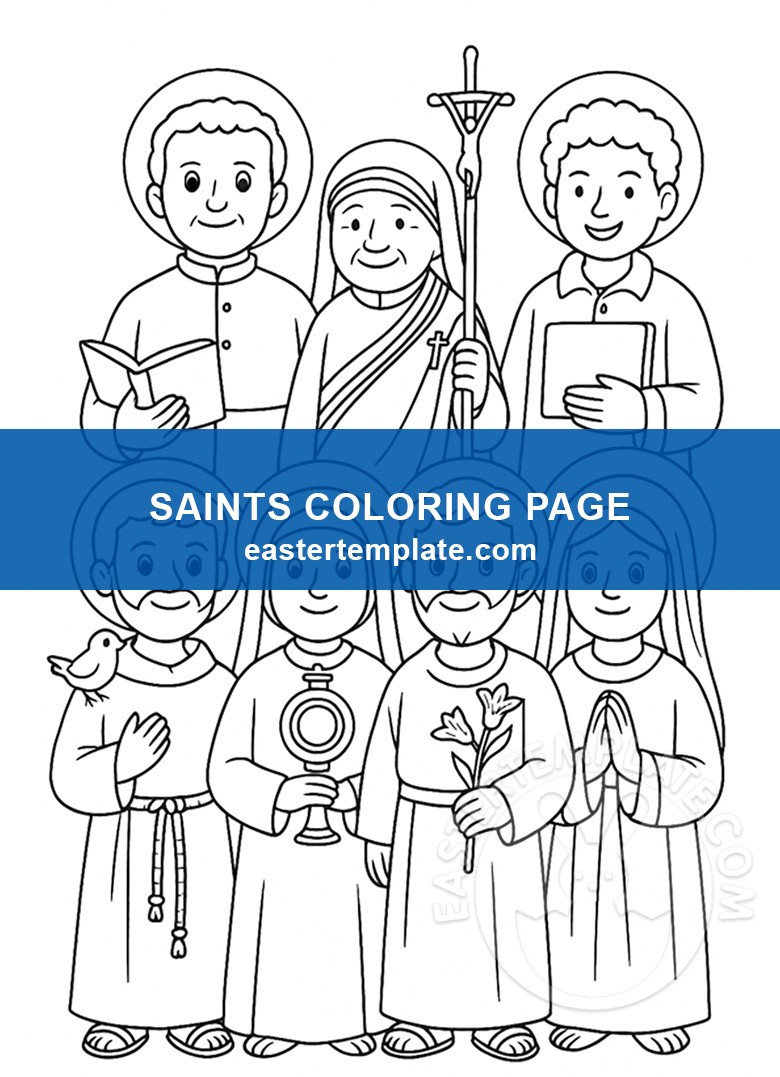 A sweet saints coloring page for kids with recognizable holy figures, perfect for Sunday school or All Saints’ Day activities.